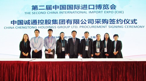 11月7日,中國(guó)誠(chéng)通交易分團(tuán)在進(jìn)博會(huì)上舉辦集體簽約儀式。中國(guó)誠(chéng)通集團(tuán)副總裁李友生、誠(chéng)通東方總經(jīng)理關(guān)武出席并見(jiàn)證簽約。