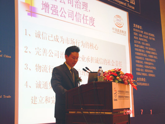 在7月1日上午中國(guó)大飯店舉辦的中國(guó)國(guó)際服務(wù)業(yè)大會(huì)現(xiàn)代物流論壇主報(bào)告會(huì)上,商務(wù)部高虎城副部長(zhǎng)、發(fā)改委馬力強(qiáng)局長(zhǎng)、鐵道部胡亞?wèn)|副部長(zhǎng)、海關(guān)總署龔正副署長(zhǎng)、國(guó)家外匯管理局李東榮副局長(zhǎng)分別就促進(jìn)我國(guó)現(xiàn)代物流發(fā)展的相關(guān)政策做了報(bào)告,中國(guó)誠(chéng)通控股公司和中遠(yuǎn)集團(tuán)公司作為中國(guó)現(xiàn)代物流企業(yè)的代表發(fā)表演講。馬正武董事長(zhǎng)發(fā)表了題為《現(xiàn)代物流企業(yè)的社會(huì)責(zé)任》的演講。馬士基集團(tuán)全球執(zhí)行副總裁、美國(guó)服務(wù)業(yè)聯(lián)盟總裁、歐洲物流協(xié)會(huì)會(huì)長(zhǎng)也就相關(guān)論題做了演講。